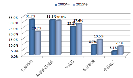 中國制藥工業五大子行業比重變化