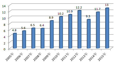 我國制藥工業百強規模不斷擴大,從2005年的1,451億元增長到2015年的10,458億元,擴大了6.2倍。2015年,中國制藥工業百強規模增速為10.8%。