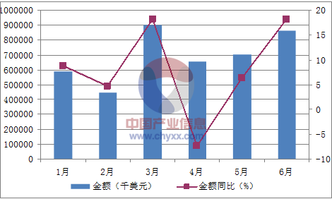月份金額(千美元)金額同比(%)1月5917538.82月4461194.73月90172118.24月656369-7.35月7050026.46月86100318.1
