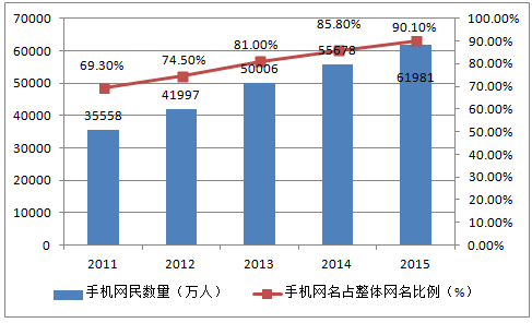 2011-2015年中國手機網民數量及占總網民數量比率