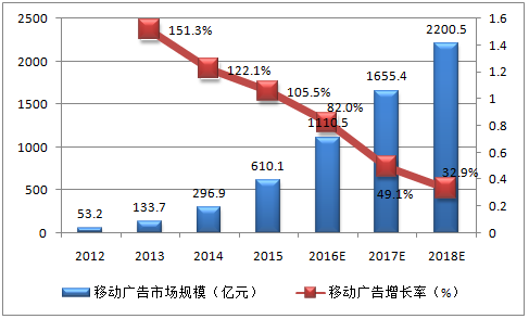 2012-2018年中國移動廣告市場規模預測
