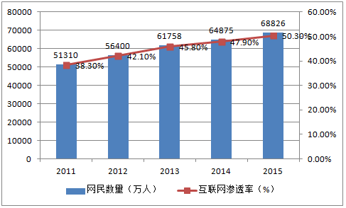 2011-2015年中國網民數量及互聯網滲透率