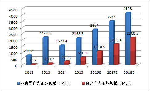 2012-2018年中國互聯網廣告及移動廣告市場規模對比圖