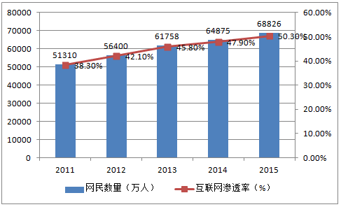2011-2015年中國網(wǎng)民數(shù)量及互聯(lián)網(wǎng)滲透率