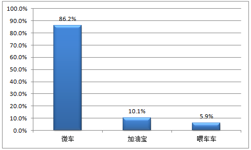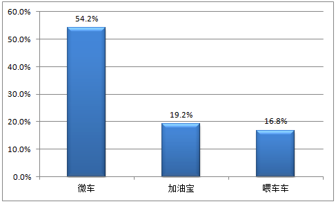 2015年第3季度微車、加油寶和喂車車分別以86.2%、10.1%和5.9%的比例占據(jù)中國移動加油服務(wù)APP活躍用戶覆蓋率前三名;钴S用戶覆蓋率:即定義周期內(nèi),至少使用過一次該服務(wù)的用戶在至少使用過該領(lǐng)域任一服務(wù)的用戶中的占比。