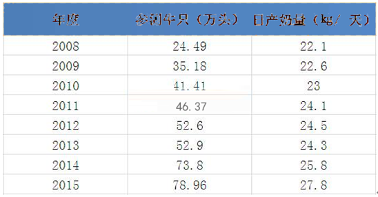 2015年,全國荷斯坦奶牛平均單產6噸,同比增加500kg,比2008年增加1.2噸。對1200多個100頭以上的規模牧場奶牛生產性能測定顯示,奶牛平均日產27.8kg,折合年單產8.3噸。