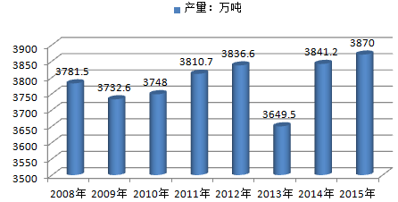 2015年,中國奶類產量3870萬噸,同比增長0.7%,比2008年增長2.3%。其中,牛奶產量3755萬噸,同比增長0.8%;羊奶等其他奶類產量115萬噸,同比下降1.4%。中國奶類產量位于印度和美國之后,居世界第三位,約占全球總產量4.8%。