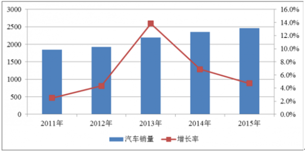 整車企業 2014 年的銷售產值達 25,517億元,2010 年-2014 年間的年度復合增長率達 8.0%。2014 年汽車銷量達到 2,349 萬輛,同比增長 6.7%,2015 年全年汽車銷量達到 2,460 萬輛,同比增速為 4.7%。中國汽車行業進入穩定發展期,自 2013年以來,連續三年超過 2,000 萬輛;乘用車增長較快,在 2015 年首次超過 2,000萬輛,為 2,115 萬輛,同比增長 7.3%。
