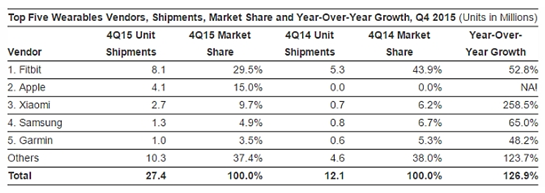 2015年第四季可穿戴設備出貨量