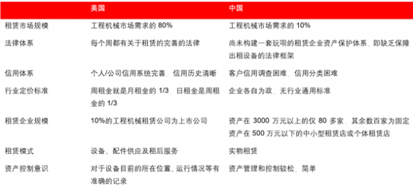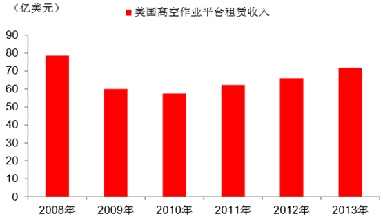 在美國的設備租賃業中,高空作業平臺是排名第一位的設備,約占保有 設備的 50%。目前,美國設備租賃商手中共有 50 萬臺高空作業平臺,其中最大的租賃公司聯合租 賃就擁有 10 萬臺。聯合租賃公司在美國的 49 個州和加拿大的 10 個省份設有 880 個網點,設備總 產值達到 94 億美元。聯合公司所擁有的價值 94 億美元的設備中,高空作業平臺占比達到 43%。