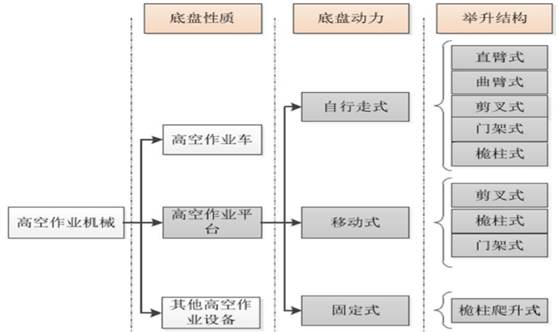 根據高空作業平臺的底盤是否自帶行駛動力可以將其分為自行走式高空作業平臺和移動式高空作業平臺。其中,前者配備內燃機或電動機,具有行駛能力;后者無行駛動力,底盤的移動往往由外力推動完成