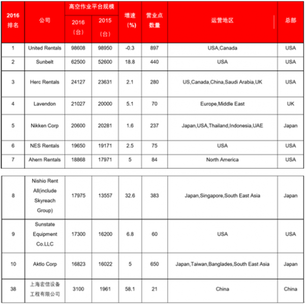 世界 top5/top10/top50 租賃廠商高空作業平臺保有量