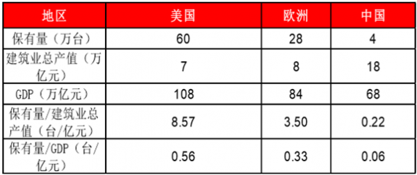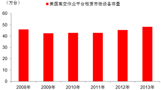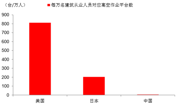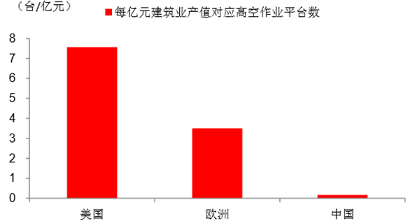 目前,我國高空作業平臺市場容量較小,高空作業平臺產品沒有被廣泛應用。大量的高空作業仍以使用腳手架為主,有些則使用叉車替代,少數情況下甚至用起重機頂部安裝一個平臺框來達到高空作業的目的。其原因在于國內高空作業平臺發展較晚,國內市場對本行業認識度不高,相關法律法規也不健全,租賃市場目前發展還不 健全,客觀上阻礙了行業的發展壯大。2015 年我國高空作業平臺保有量為 4 萬臺左右, 美國超過 60 萬臺,歐洲超過 28 萬臺,對應到建筑業產值和建筑業從業人員數上,差距更大。