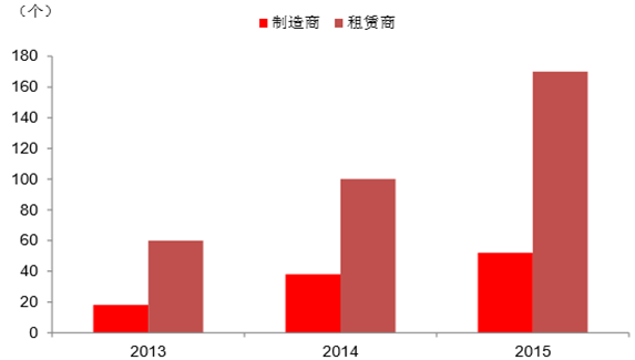 國內高空作業平臺表現良好不僅表現在產銷量方 面,還表現在制造企業和租賃企業數量的增長。2011 年,國內高空作業平臺制造商只有 20 家左右,高空作業平臺租賃商僅有十幾家。經過近幾年迅猛發展,據國際高空作業聯盟統計,目前國內 高空作業平臺制造商已經增長到 50 家左右,至 2014 年底國內從事高空作業平臺租賃的企業約 150-200 家,用于租賃的高空作業平臺數量 15000 臺左右,到 2015 年年底用于租賃的高空作業平臺數量達到將近 30000 臺,高空作業平臺租賃滲透率達到 75%。