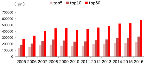 美國的工程機械中 80%是在租賃 市場,且工程機械租賃公司中有 10%已經實現上市。租賃商覆蓋范圍極廣,每個小鎮上都有租賃商覆蓋,基本實現“村村通”。租賃的內容不僅包括機械設備本身,還包括配件供應及租后服務,突出一系列工作組成的價值鏈的一體化服務。大大降低終端用戶的首次使用成本和維護成本,有力推動了高空作業平臺應用的普及和行業發展。同時,也使租賃公司的設備采購成為高空作業平臺制造企業在歐美市場上的重要需求來源。與美國相比,中國高空作業平臺租賃規模小,增速快。國內 最大的高空作業平臺租賃企業上海宏信設備工程有限公司 2016 年高空作業平臺的保有量為 3100 臺,不及美國聯合租賃公司的三十分之一。但從增速上來看,2016 年上海宏信高空作業平臺保有 量同比增加了 58%。
