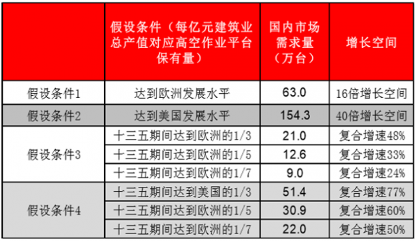 從高空作業平臺使用密度來看,目前美 國每億元建筑業產值對應的高空作業平臺量為 8.57,歐洲為 3.5,而中國僅為 0.22,差距大。隨著我國下游租賃商的成熟及國家對安全作業重視度的提高,未來我國高空作業平臺有望迎 來一個快速發展期。假設未來我國高空作業平臺發展達到歐洲水平,則對應高空作業平臺量為 63 萬臺,目前我國保有量只有 4 萬臺,擁有 16 倍增長空間,對應的市場規模有望達到近千億元規模; 假設未來達到美國水平,則對應的增長空間為 40 倍。同時對十三五期間的增速進行各種情況 下的測度,預計十三五期間我國高空作業平臺行業復合增速有望達到 40%。