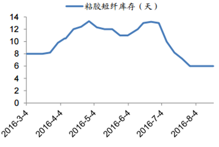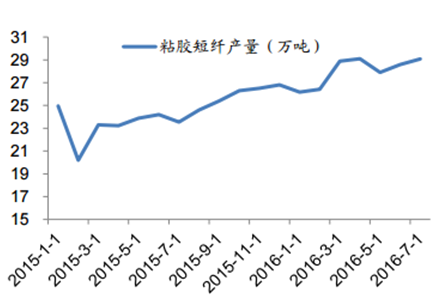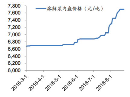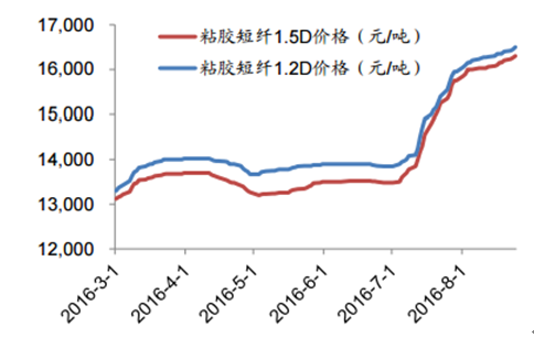 棉花價(jià)格上漲通過(guò)產(chǎn)品替代效應(yīng)帶動(dòng)粘膠短纖、溶解漿價(jià)格上漲。根據(jù)報(bào)告,2016年7月以來(lái),粘膠短纖市場(chǎng)價(jià)格不斷上漲,粘膠短纖1.5D 價(jià)格從7月1日13,480元/噸,上漲2,820元/噸,至8月24日為16,300元/噸,漲幅達(dá) 20.92%。粘膠短纖1.2D價(jià)格從7月1日13,850元/噸,上漲2,650元/噸,至8月24日為 16,500元/噸,漲幅達(dá)16.06%。截至7月末,中端廠家報(bào)價(jià)在15,700-16,000元/噸, 高端廠家報(bào)價(jià)在16,000元/噸。價(jià)格上漲的部分原因?yàn)槊藁▋r(jià)格大漲,市場(chǎng)信心增強(qiáng)。 且華北及華東地區(qū)有部分粘膠短纖廠家裝置檢修,行業(yè)開(kāi)工率為8.1成,供給有所降 低。