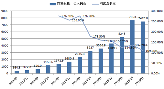 2016年第1季度,中國移動網購市場交易規模達7476.8億元,同比增長109.6%。