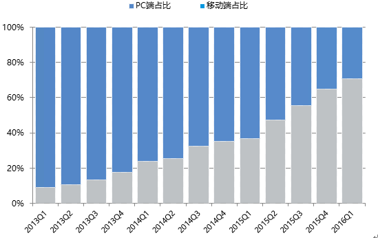 2015年,移動網購在中國整體網上零售占比已達到52.5%,2015年第4季度,受雙十一影響,網絡零售移動端占比更是超過65%。2016年1季度移動端占比進一步提升,超過70%。