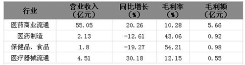 在行業方面:報告期內,公司在醫藥商業流通行業實現55.05億元的營業收入,同比增長20.26億元,實現毛利額5.66億元,在醫藥制造、保健品、食品、醫藥器械流通等行業均未實現1億元的毛利額。