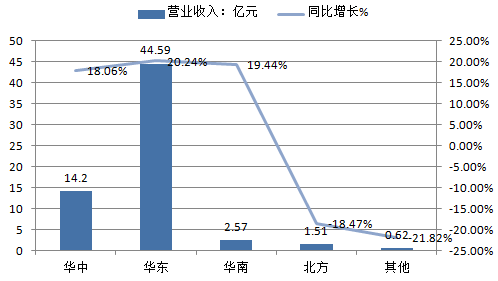 在地區方面:報告期內,公司在華東地區實現營業收入44.59億元,為各地區之首。