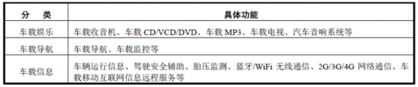 車載電子產品是汽車電子產品中的重要組成部分,是運用計算機、衛星導航定位、通訊、多媒體、控制等技術來提供影音娛樂、導航定位、車輛信息、通訊服務的電子設備;在汽車環境下能夠獨立使用,和汽車本身的性能并無直接關系,主要包括車載娛樂、車載導航及車載信息等三類功能。