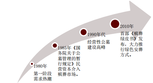 經營性公墓自改革開放以后才真正發展起來。公墓第一階段的需求熱潮發生在 1980 年代,火葬代替土葬政策鼓勵使全國經營性公墓增加三百多家。 經營性公墓建設高峰發生在 1990 年代,1985 年《國務院關于公墓管理的暫行規定》 從制度層面肯定并規范了市場,隨后境內外民營資本介入殯葬市場。而近年來,為了保 護土地資源,政府開始倡導其他更為生態的落葬選擇,因而對經營性墓園的審批數量逐 漸減少,鼓勵建設公益性公墓,使得從事經營性公墓的服務機構數量增長也逐漸趨緩。