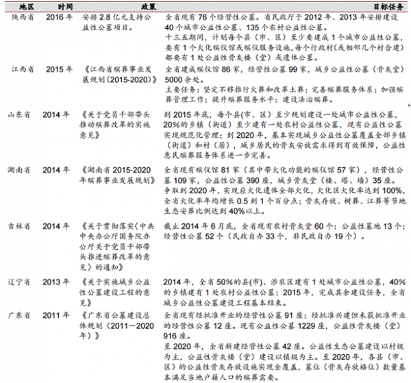 2)墓地資源稀缺性很高,導致合法合規的經營性公墓溢價很高。在我國,經營性公墓 的審批受到國家嚴格管制。在國家大力倡導生態安葬和節地安葬的政策導向下,公墓土 地和牌照的審批日趨嚴格。雖然,大部分地區都沒有言明要停止審批,但實質上審批成 功的難度很高,很多省份或城市基本上新增經營性公墓都很少或者沒有了。