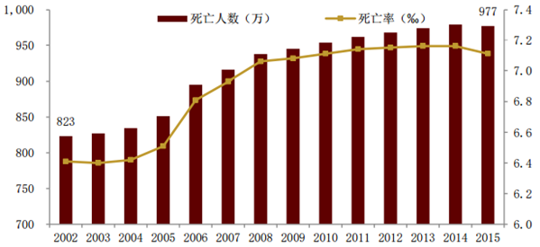 2002 年我國死亡人口 數(shù)為 823 萬人,死亡率為 6.4‰。近年來,我國人口死亡率較 02 年雖有所增長但一直 較為穩(wěn)定,保持在 7.1‰左右。2015 年,我國死亡人口增加到 977 萬人。未來隨著我 國總?cè)丝谟绕涫抢淆g化人口的提升,死亡率和死亡人口都會(huì)出現(xiàn)相應(yīng)的增長。