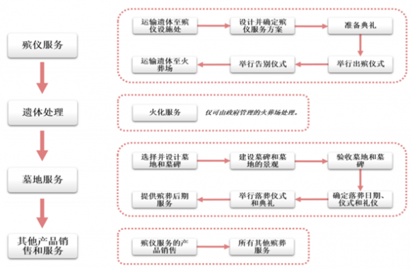 殯葬行業(yè)由殯儀服務(wù)、遺體處理、墓地服務(wù)和其他產(chǎn)品銷售服務(wù)四大部分組成