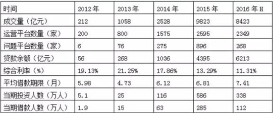 2016年上半年,我國(guó)P2P信貸行業(yè)的成交量是8423億元,運(yùn)營(yíng)平臺(tái)數(shù)量達(dá)到2349家,問(wèn)題平臺(tái)數(shù)量達(dá)到268家;行業(yè)貸款余額是6213億元,綜合利率達(dá)到11.31%。