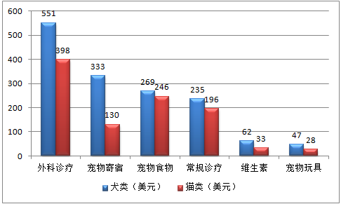 2015年美國寵物狗平均產(chǎn)生1650美元開支,寵物貓則為1130美元。綜合寵物狗和寵物貓可以發(fā)現(xiàn),外科診療是開支最多的項目,此外對于寵物狗來說,寄宿、食物為重要開支;而對于寵物貓花費在食物和常規(guī)診療方面費用更多。