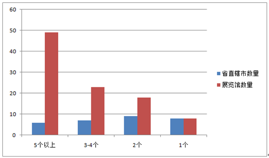 綜合來看,擁有5個以上展覽館的省、直轄市共有6個,合計展覽館數量49個,約占全國展覽館總數的50%;擁有3-4個展覽館的省、直轄市有7個,合計展覽館數量23個,約占全國展覽館總數的23%;擁有2個展覽館的省、直轄市有9個,合計展覽館數量18個,約占全國展覽館總數的18%;擁有1個展覽館的省份有8個,合計展覽館數量8個,約占全國展覽館總數的8%。