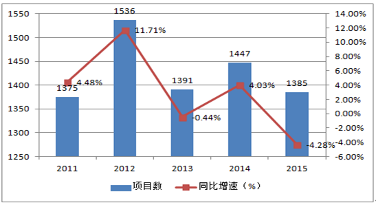 2011-2015年中國出國展覽項目數量變化趨勢圖