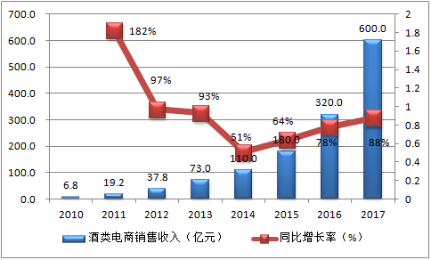 茅臺、五糧液、瀘州、洋河等酒企巨頭或“自建門戶”或尋求合作,均積極開辟電商領域;酒仙網、酒美網、1919、中酒網等酒水電商平臺備受資本推崇,酒類B2C交易額逐年大幅上升。2016-2017年酒類電商行業銷售收入預測