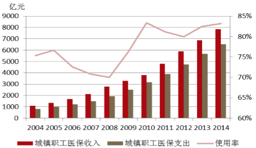 數據顯示,2004-2013 年期間,新農合基金的使用率呈現快速上升趨勢,到 2012 年,我國東部地區已經出現基金使用率超過 100%, 即開始出現當期新農合基金收不抵支、消耗以前年份累計的余額。而 城鎮職工基本醫保基金使用率同樣呈現上升趨勢,超過 80%。人社部 社會保障研究所所長金維剛曾說,從 2013 年情況來看,全國 225 個 統籌地區的城鎮職工醫保資金出現收不抵支,占全國城鎮職工統籌地 區的 32%,其中 22 個統籌地區將歷年累計結余全部花完。在城鎮居民 醫保方面,2013 年全國有 108 個統籌地區出現收不抵支。《中國醫療衛生事業發展報告2014》預測,2017 年城鎮職工基本醫療保險基金 將出現當期收不抵支的現象,到 2024 年將出現累計結余虧空 7353 億 元的嚴重赤字。