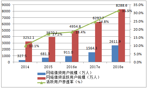 2015年我國網絡借貸用戶規模達3970.1萬人,其中活躍用戶人數達681.3萬。隨著網絡借貸行業的進一步發展,用戶教育工作的逐步擴展和深化,網絡借貸行業的活躍用戶數占比還將進一步提高,至2018年,將達網絡借貸用戶規?倲档31.5%。