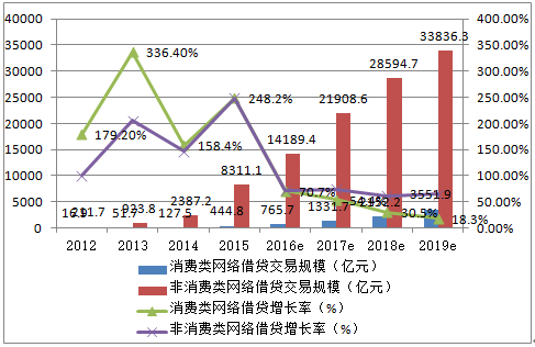 2012-2019年中國消費類與非消費類網絡借貸交易規模