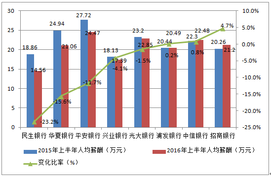 核心提示:看來這一輪受降薪潮沖擊的金融機(jī)構(gòu),還不只是券商,“躺著賺錢”的銀行,也在受沖擊之列。16家上市銀行中,多達(dá)10家銀行人均薪酬出現(xiàn)不同程度的下滑,其中民生銀行上半年人均薪酬同比下滑23.2%至14.6萬元,無論是下滑幅看來這一輪受降薪潮沖擊的金融機(jī)構(gòu),還不只是券商,“躺著賺錢”的銀行,也在受沖擊之列。16家上市銀行中,多達(dá)10家銀行人均薪酬出現(xiàn)不同程度的下滑,其中民生銀行上半年人均薪酬同比下滑23.2%至14.6萬元,無論是下滑幅度還是絕對金額,均位列上市銀行第一位。幾家歡喜幾家愁,16家銀行中,仍有6家銀行上半年人均薪酬有所增加,其中寧波銀行、南京銀行分別同比實(shí)現(xiàn)28.6%、17.7%的增幅。