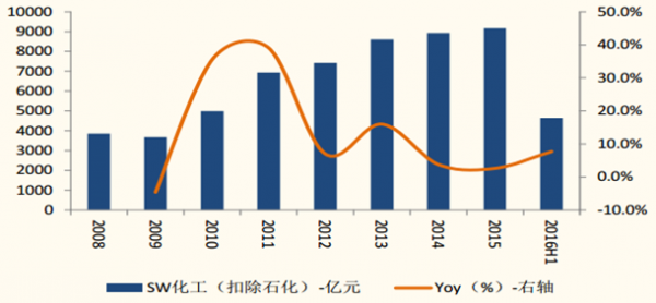 2016 上半年原油價格逐步企穩進入震蕩區間,全行業收入水平呈現回暖態 勢。SW 化工行業收入增速下降的趨勢逐步得到緩解,扣除 SW 石化行業營業收入同比提升 7.7%,顯著高于 2015 年 2.6%的水平。