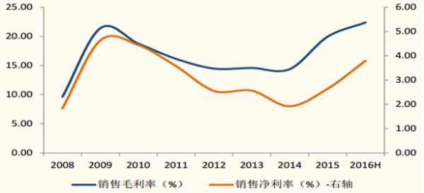 在行業整體收入規模回暖的同時,全行業的盈利能力也得到修復。行業整 體的毛利率以及凈利率水平都較之 2015 年呈現一定的回升。SW 化工行業2016 上半年銷售毛利率為 22.36%,較 2015 年上升 2.44 個百分點;銷售 凈利率 3.79%,較 2015 年提升 1.15 個百分點。