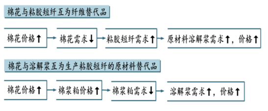 核心提示:棉花價格和溶解漿價格應呈正向變動關系,其可以從棉花與粘膠短纖互為替代品、棉花與溶解漿為互為生產粘膠短纖的原材料替代品兩方面來分析。第一,棉花與與粘膠短纖分別為天然纖維和纖維素纖維代表品,其兩者作為紡織、軍事、環保、醫藥領域的工業原料互為替代棉花價格和溶解漿價格應呈正向變動關系,其可以從棉花與粘膠短纖互為替代品、棉花與溶解漿為互為生產粘膠短纖的原材料替代品兩方面來分析。第一,棉花與與粘膠短纖分別為天然纖維和纖維素纖維代表品,其兩者作為紡織、軍事、環保、醫藥領域的工業原料互為替代品。當整體纖維需求大體穩定時,棉花價格上漲使棉花需求降低,其替代品粘膠短纖需求增加,價格上升。進而,粘膠短纖的生產材料溶解漿需求增加,價格上升。第二,由棉花生產的棉漿粕也可用于生產粘膠短纖,因此棉花及溶解漿互為生產粘膠短纖的原材料替代品。即使粘膠短纖需求一定,棉花價格上漲導致采用棉漿粕方法生產粘膠短纖的生產成本上升,廠商會在盈利驅動下轉向采用溶解漿方法生產,溶解漿需求增加,溶解漿價格上升。