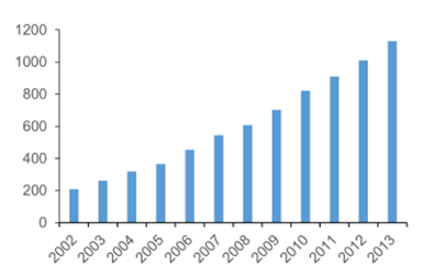 2002-2013產業用紡織品行業纖維加工量(萬噸)