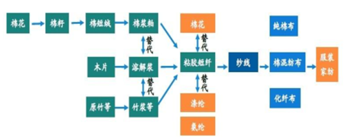 污染小、資源豐富、價格低三大特點促進溶解漿方法發展。從全球范圍來看,溶解漿在粘膠短纖原料中占比提升是大勢所趨。盡管溶解漿與棉漿粕制成的粘膠短纖差異很小。但是,棉漿粕的生產對環境污染大,且原料取自于棉,供給易受棉花產量的限制;溶解漿的生產過程對環境污染較小,原料木片資源豐富,且價格低于棉漿粕。因此,近年來溶解漿在粘膠短纖原料中的占比持續提升,且已超過棉漿粕。未來隨著國內對棉漿粕的污染整治不斷推進,這種趨勢還將延續下去。
