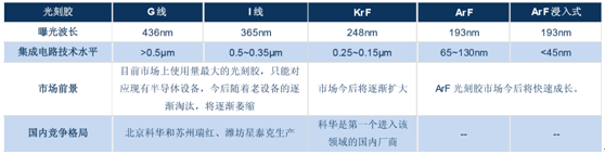 目前,我國半導體光刻膠使用量最大的為紫外正性光刻膠(I-線),市場使用量為 280 噸/年,銷售額 2.12 億元;其 次為深紫外光刻膠(ArF),市場使用量為 160 噸,銷售額為 5.1 億元。目前國內生產的 IC 光刻膠以 G 線和 I 線光刻 膠為主,科華是第一個進入 KrF(248nm)光刻膠領域的國內廠商,并且已經通過中芯國際的認證,ArF(193nm) 光刻膠也僅有科華立項。