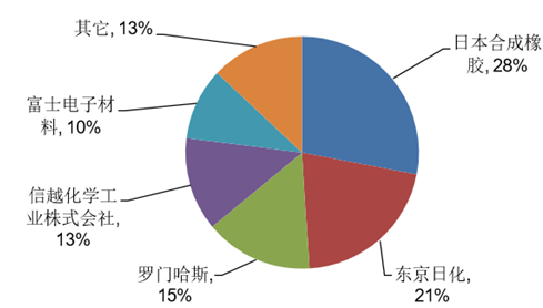 目前,全球光刻膠市場規模為350億元,其中我國市場規模在100億元左右,目我國光刻膠消費量約1400噸,其中,國內低端產品產能約為300噸/年,高端產品主要依賴進口,對外依存度達80%。目前供應光刻膠的企業,大部分都由在半導體產業發展初期就開始參與市場的有機感光材料龍頭企業所占據。國內生產光刻膠的主要企業有飛凱材料、北京化學試劑研究所、蘇州瑞紅、北京科華、無錫化工設計研究院等。國內光刻膠生產企業普遍規模較小、產品質量不高,與國外差距較大。預計未來隨著國內企業技術的不斷成熟和新建項目的陸續投產,光刻膠進口替代空間巨大。