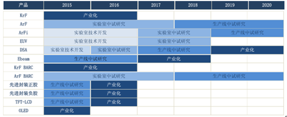 技術對國內光刻膠企業而言,是市場份額的攔路虎,還是 實現彎道超車的殺手锏,關鍵取決于國內企業的戰略布局與研發水平。2014 年,北京科華、中科院化學所、蘇州瑞 紅、濰坊星泰克和徐州博康共同討論并制定了中國光刻膠的發展路線圖。
