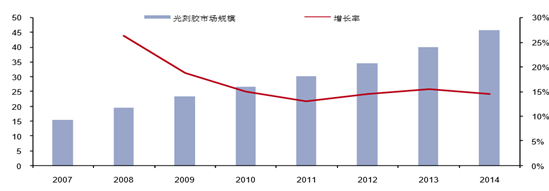 全球光刻膠市場規模持續增長,2014 年達到 70.2 億美元。與全球市場相比,國內光刻膠市場規模增速更快,年均 復合增長率(CAGR)達到 16.7%,未來光刻膠市場需求依然保持快速增長。