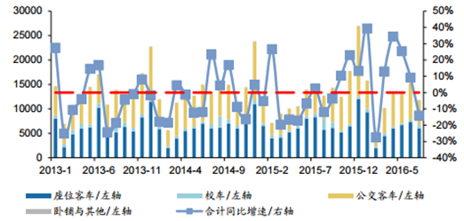 7月客車(含輕客)出口2759輛,同比上升11.5%;內銷16237輛,同比下降19.7%。 其中,座位客車內銷8864輛,同比下降23.3%,出口2229輛,同比上升4.2%;公交 客車內銷5003輛,同比下降20.0%,出口524輛,同比上升63.2%。7月客車(含輕 客)銷量同比下降由于內銷銷量下降所致。