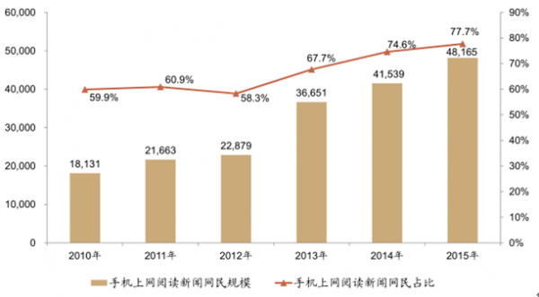 2010 年通過手機上網閱讀新聞信息的網民規模為 1.81 億人,2015 年該數據已上升到 4.82 億人。2010 年手機上網閱讀新聞的網民占總體網民比例為59.9%,2015 年 12 月該比例已提高至 77.7%。